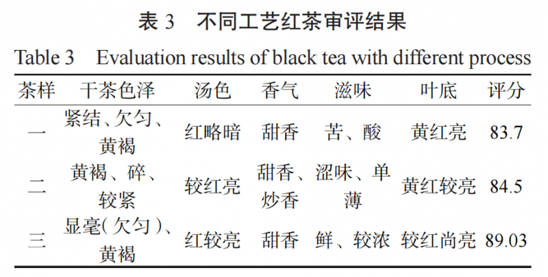 由表 3 可知:三號茶樣外形緊結(jié)顯毫,湯色紅較亮,滋味鮮濃,香氣給人一種舒適的甜香,葉底紅尚亮;一號茶樣外形緊結(jié)黃褐欠勻整,湯色較暗,滋味苦中帶酸,葉底黃紅亮;二號茶樣外形碎、黃褐,湯色較紅亮,甜香中帶有炒香,滋味較單薄,葉底黃紅較亮。