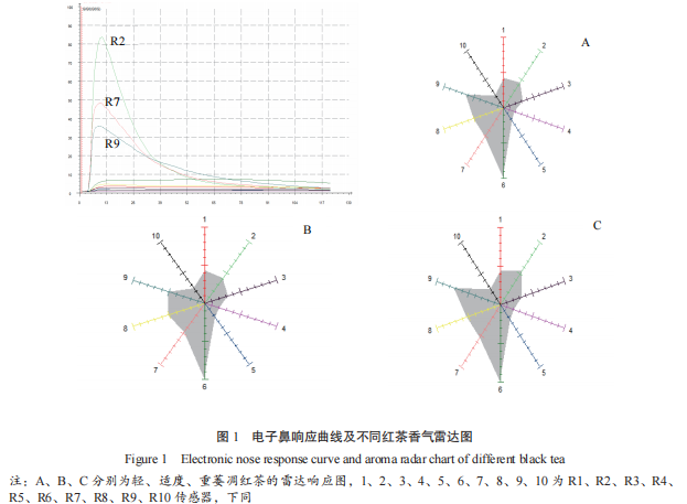 利用電子鼻檢測技術(shù),結(jié)合 PCA 分析、Loadings 分析和 LDA 分析數(shù)據(jù)統(tǒng)計(jì),對不同萎凋程度的三組紅茶香氣進(jìn)行分析,結(jié)合感官審評探究電子鼻在區(qū)分不同工藝對茶葉香氣影響的可行性。電子鼻技術(shù)對不同工藝的紅茶均有較好的響應(yīng),可有效區(qū)分不同萎凋程度的紅茶,且第 R7、R9、R2、R6 和 R8 傳感器在紅茶香氣區(qū)分中起主要作用,即萜烯類和硫化物、芳香化合物、氮氧化合物、醇類和烷類對紅茶香氣貢獻(xiàn)較大。感官審評表明重萎凋工藝制得的山東紅茶品質(zhì)更佳。 來源:感官科學(xué)與評定 轉(zhuǎn)載請注明來源。