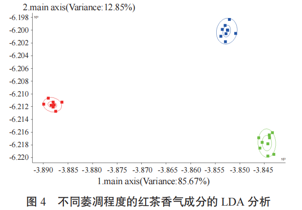 LDA 更側(cè)重于同一類別的空間分布狀態(tài)和距離的精度。LDA 分析是在 PCA 分析后對傳感器響應(yīng)紅茶香氣成分的優(yōu)化,通過擴(kuò)大差異更直觀的表現(xiàn)不同提香工藝紅茶香氣之間的區(qū)別。圖 4 中第一主成分貢獻(xiàn)率為 85.67%,第二主成分貢獻(xiàn)率為 12.85%,總貢獻(xiàn)率為98.52%,能很好的反應(yīng)紅茶香氣的信息。由圖4 得知,重萎凋與其他兩組距離較遠(yuǎn),可以在線性判別分析完全區(qū)分開;而在第一主成分的貢獻(xiàn)率中,輕萎凋和適度萎凋相差不大,這與 PCA 分析以及感官審評結(jié)果一致,表明這兩種萎凋程度對茶葉香氣的改變差異較小。整體結(jié)果對比 PCA 分析較為相似,說明電子鼻在區(qū)分不同萎凋程度的紅茶香氣中具有可行性。