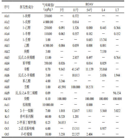 式中:Cri、Ti分別為各揮發(fā)性化合物的相對(duì)含量/%和氣味閾值/(μg/kg);Crstan、Tstan分別為對(duì)樣品風(fēng)味貢獻(xiàn)最大組分的相對(duì)含量/%和氣味閾值/(μg/kg)。 ROAV≥1的物質(zhì)為該品種金針菇的特征揮發(fā)性物質(zhì);0.1≤ROAV<1的物質(zhì)對(duì)該品種金針菇整體風(fēng)味有修飾作用,且ROAV越大說(shuō)明該物質(zhì)對(duì)該品種樣品總體風(fēng)味貢獻(xiàn)越大。 不同品種金針菇揮發(fā)性物質(zhì)的SPME-GC-MS分析 如表1所示,5個(gè)品種金針菇樣品中共檢測(cè)出53種揮發(fā)性成分,3號(hào)、11號(hào)、54號(hào)、L4和L7分別檢測(cè)出21、29、21、12種和18種成分,其中醇類、醛類和芳香烴類占總含量的60%~95%。不同品種金針菇僅有2種共有揮發(fā)性成分,分別為1-己醇和2-十一烷酮。每種金針菇都有3種或3種以上其他品種中不存在的化合物,3號(hào)、11號(hào)、54號(hào)、L4和L7中特有化合物數(shù)量分別為3、12、3、4種和4種。 表1 不同品種金針菇樣品中揮發(fā)性化合物的相對(duì)含量 如表2所示,辛醛、苯乙醛、壬醛、癸醛、2-十一烷酮、2-甲基丁酸甲酯、D-檸檬烯為3號(hào)金針菇的特征揮發(fā)性物質(zhì)(ROAV≥1),香葉基丙酮對(duì)3號(hào)金針菇的整體風(fēng)味起修飾作用(0.1≤ROAV<1);1-己醇、反式-2-庚烯醛、辛醛、反式-2-辛烯醛、壬醛、2-十一烷酮、香葉基丙酮、2-正戊基呋喃、D-檸檬烯為11號(hào)金針菇的特征揮發(fā)性物質(zhì)(ROAV≥1),1-庚醇、1-辛醇對(duì)11號(hào)金針菇的整體風(fēng)味起修飾作用(0.1≤ROAV<1);1-壬醇、辛醛、壬醛、癸醛、2-十一烷酮、D-檸檬烯為54號(hào)金針菇的特征揮發(fā)性物質(zhì)(ROAV≥1),1-辛醇、反式-2-庚烯醛對(duì)54號(hào)金針菇的整體風(fēng)味起修飾作用(0.1≤ROAV<1);1-壬醇、庚醛、辛醛、反式-2-辛烯醛、癸醛、2-十一烷酮、2-正戊基呋喃為L(zhǎng)4金針菇的特征揮發(fā)性物質(zhì)(ROAV≥1),1-己醇對(duì)L4金針菇的整體風(fēng)味起修飾作用(0.1≤ROAV<1);反式-2-辛烯醛、反,反-2,4-癸二烯醛、癸醛、2-十一烷酮為L(zhǎng)7金針菇的特征揮發(fā)性物質(zhì)(ROAV≥1),1-己醇、1-辛醇、反式-2-庚烯醛對(duì)L7金針菇的整體風(fēng)味起修飾作用(0.1≤ROAV<1)。 5種金針菇中共檢測(cè)出5種醇類化合物,存在于4個(gè)品種金針菇中的1種,是1-辛醇,1-庚醇和1-戊醇均只在11號(hào)金針菇中被檢測(cè)到。 5種金針菇中共檢測(cè)出10種醛類化合物,在4種金針菇中被檢測(cè)到的有3種,分別為己醛、辛醛和癸醛,庚醛、苯乙醛和反,反-2,4-癸二烯醛分別是L4、3號(hào)和L7金針菇中特有化合物。酸類化合物只在54號(hào)金針菇中被檢測(cè)到,5種金針菇中共檢測(cè)出7種酯類化合物。其中只有鄰苯二甲酸二異丁酯存在于2種金針菇中,其他6種化合物均屬于特有化合物。5種金針菇中共檢測(cè)出3種酮類化合物,共有的1種,為2-十一烷酮。 5種金針菇中共檢測(cè)出6種烷烴類化合物,特有化合物2種,分別為壬烷和2,6,10,14-四甲基十六烷。 5種金針菇中共檢測(cè)出5種其他類化合物,獨(dú)有化合物有2種,分別為2-甲基-2-(1-甲基乙基)環(huán)氧乙烷和4,5,6,7-四氫-3,6-二甲基-苯并呋喃。 表2 不同品種金針菇樣品中揮發(fā)性成分及對(duì)應(yīng)的ROAV 為了顯示5個(gè)品種金針菇樣品組中53種揮發(fā)性成分的差異,使用PCA對(duì)SPME-GC-MS進(jìn)行分析。如圖1所示,前2個(gè)主要成分的貢獻(xiàn)率是85.15%;PC1占52.31%,PC2占32.84%。PC1和PC2都明確區(qū)分了不同品種,5個(gè)樣本組相互之間很好地分開(kāi),說(shuō)明不同品種金針菇間揮發(fā)性風(fēng)味相互獨(dú)立,且這2個(gè)主成分可代表樣品風(fēng)味的主要特征。所有的揮發(fā)組分根據(jù)不同品種樣品組也同樣明顯地區(qū)分開(kāi),其中,54號(hào)金針菇樣品組與12種化合物分布重疊,11號(hào)金針菇樣品組與4種化合物分布重疊。而其他3個(gè)品種樣品組雖然沒(méi)有與化合物重疊,但四周都有各自相關(guān)的化合物。然而還是有很多比較分散的化合物,處于不同品種之間。這表明盡管使用53種揮發(fā)性化合物也可以將品種區(qū)分開(kāi),但是金針菇的揮發(fā)性風(fēng)味物質(zhì)較復(fù)雜,并且在不同品種中有許多相似的物質(zhì),因此僅用SPME-GC-MS判別不同品種金針菇風(fēng)味較為局限。 圖1 不同品種金針菇樣品基于SPME-GC-MS的PCA 為了進(jìn)一步分析SPME-GC-MS對(duì)于不同品種金針菇揮發(fā)性風(fēng)味成分區(qū)分情況,將SPME-GC-MS數(shù)據(jù)進(jìn)行HCA,結(jié)果如圖2所示。從圖2可以看出,不同品種金針菇揮發(fā)性成分的聚類樹(shù)狀圖顯示出3個(gè)主要類別。其中,11號(hào)、54號(hào)和L7的樣品被歸為一類,而L4和3號(hào)的樣本被分別歸為其余兩類。在第一大類中,11號(hào)和54號(hào)的樣品在最小距離水平上首先聚類,這說(shuō)明二者的樣品揮發(fā)性成分相似度很高。隨著歐式距離的增加,L7的樣品也并入到這一類中。而當(dāng)歐式距離增加至13時(shí),L4與11號(hào),54號(hào)和L7的樣品歸為一類。隨著歐式距離的繼續(xù)增大,當(dāng)增至25時(shí),三大類才歸為一類。這與2.1.2節(jié)結(jié)果一致。HCA差異主要由不同品種中各類化合物種類和含量不同造成。結(jié)合表1可知,由于醇類、醛類和芳香烴類物質(zhì)占所檢測(cè)總物質(zhì)的60%~95%,因此影響樣品聚類的主要因素