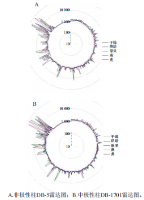 快速氣相色譜型電子產(chǎn)品鼻是基于仿生學(xué)原理,由傳感器傳感器陣列和模式識(shí)別系統(tǒng)組成,是一種新型電子分析儀器,其采用2根極性差異的色譜柱DB-5和DB-1701對(duì)氣味實(shí)現(xiàn)快速識(shí)別與解析,具備直觀簡(jiǎn)便、重復(fù)性好等優(yōu)勢(shì),結(jié)果見圖4。原果和干燥處理后的樣品總體出峰情況比較相似,烘焙和蒸、煮處理后的樣品在各個(gè)出峰部位的峰面積顯然放大,說明各種香氣物質(zhì)濃度含量及其總體香氣強(qiáng)度增加,與原果及干燥處理后相比具有一定差異。