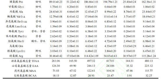 不同烹飪方式下芫根的游離氨基酸種類及含量見表2。芫根中共含有16種游離氨基酸,其中有7種必需氨基酸,8種藥用氨基酸,3種支鏈氨基酸。在所有芫根樣品中,脯氨酸占主導(dǎo)地位,其次是谷氨酸。微波及油炒后氨基酸總量顯著提高,而水煮和高壓烹飪的芫根中游離氨基酸總量顯著降低。