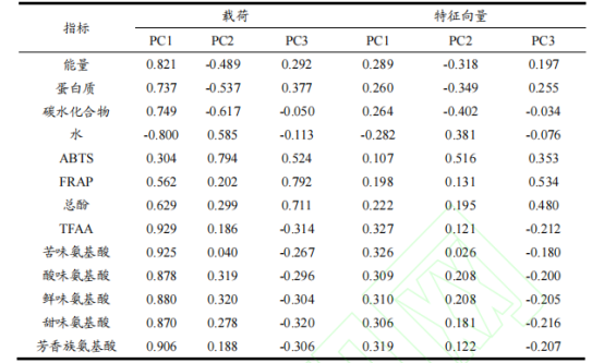 取100g樣品,利用食品熱量成分檢測(cè)儀測(cè)定樣品中的能量、蛋白質(zhì)、脂肪、碳水化合物和水分含量。 總酚含量以沒食子酸為參照物,采用Folin-Ciocalteus法測(cè)定;抗氧化能力采用鐵離子抗氧化能力法測(cè)定,均以維生素E(Trolox,TE)為標(biāo)準(zhǔn)對(duì)照。 取30g樣品,加270mL蒸餾水,利用破壁機(jī)制成勻漿,過濾,取100mL濾液上機(jī)。電子舌分析條件:采集120s,清洗180s。