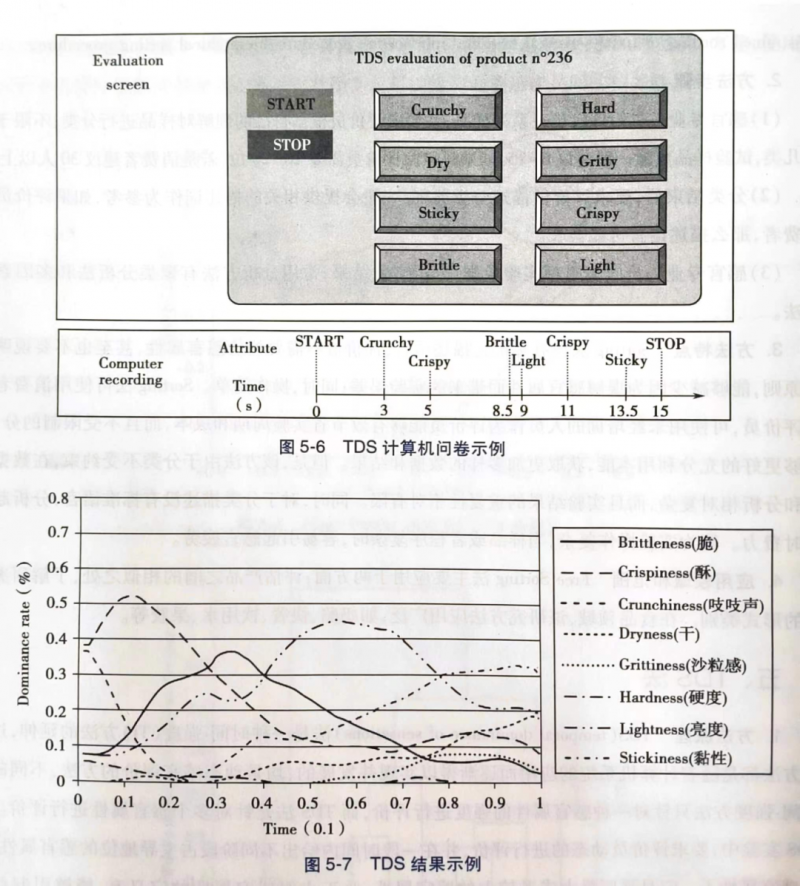 TDS(temporal dominance of sensations)法是一種時(shí)間-強(qiáng)度(TI)方法的延伸,這兩種方法都是隨著計(jì)算機(jī)系統(tǒng)的應(yīng)用而逐漸得以實(shí)現(xiàn)并發(fā)展的,均是動(dòng)態(tài)感官評(píng)價(jià)的方法,不同的是時(shí)間-強(qiáng)度方法只針對(duì)一種感官屬性的強(qiáng)度進(jìn)行評(píng)價(jià),而TDS法是針對(duì)多個(gè)感官屬性進(jìn)行評(píng)價(jià)。在TDS 實(shí)驗(yàn)中,要求評(píng)價(jià)員動(dòng)態(tài)的進(jìn)行評(píng)價(jià),并在一段時(shí)間內(nèi)給出不同階段占主導(dǎo)地位的感官屬性,主要感官屬性不一定是強(qiáng)度最大或者較大的感官屬性,關(guān)于主要感官屬性的定義有:能夠引起注意的感官屬性、持續(xù)增加并突然能被感知的感官屬性。感官專業(yè)人員通過(guò)分析實(shí)驗(yàn)結(jié)果,從而獲得不同樣品的主要感官屬性描述圖,常見(jiàn)的結(jié)果呈現(xiàn)方式是TDS曲線。問(wèn)題和結(jié)果示意圖見(jiàn)圖5-6、圖5-7。