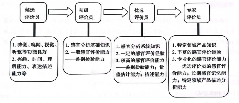 在感官評(píng)價(jià)的實(shí)踐中,往往根據(jù)不同檢驗(yàn)的要求選用不同級(jí)別的評(píng)價(jià)員,不同級(jí)別的評(píng)價(jià)員要求如下: