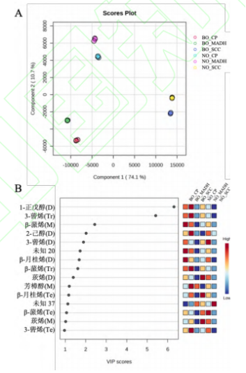為了篩選六種精油的差異揮發(fā)性化合物,基于GC-IMS檢測到的64個物質(zhì)的峰信號強度進行偏最小二乘法判別分析(PLS-DA)。如圖4A所示,PC1和PC2的貢獻率分別為74.1%和10.7%,累計貢獻率為84.8%,表明該模型能夠充分反映樣品原始信息。每一聚類中的3個點緊密聚集在一起,說明組間重復(fù)性好,GC-IMS檢測性能穩(wěn)定??梢钥闯隽N樣品有明顯的區(qū)分,NO_CP和NO_MADH均分布在上方區(qū)域,兩者差異較??;BO_CP和BO_MADH均分布在左下方,兩者也較為相似;BO_SCC和NO_SCC均分布在右側(cè)區(qū)域,同樣具有一定相似性。對于同一種甜橙,CP和MADH兩種方式提取的精油距離相近,但和SCC萃取液相距較遠,說明前兩種方式和后者提取的揮發(fā)性成分差異較大。此外,同一種方式提取的兩種甜橙精油,如BO_CP和NO_CP,BO_MADH和NO_MADH,揮發(fā)性成分也具有較大差異。 進一步地,利用變量投影重要性(VIP)篩選對樣本分類貢獻大的揮發(fā)性化合物。VIP通過PLS-DA載荷圖判別所得,VIP值越大,表明對樣本分類的貢獻越大,通常VIP>1表明該變量在區(qū)分不同樣本上起著至關(guān)重要的作用。如圖4B所示,共篩選出15種VIP>1的標(biāo)志性差異化合物,包括1-正戊醇(D)、3-蒈烯(Tr)、β-蒎烯(M)、2-己醇(D)、3-蒈烯(D)、未知20、β-月桂烯(D)、β-蒎烯(Tr)、莰烯(D)、芳樟醇(M)、β-月桂烯(Te)、未知37、β-蒎烯(Te)、莰烯(M)和3-蒈烯(Te)。其中絕大部為萜烯類化合物,少數(shù)為醇類,說明提取方式及柑橘品種對這兩類化合物影響較大。