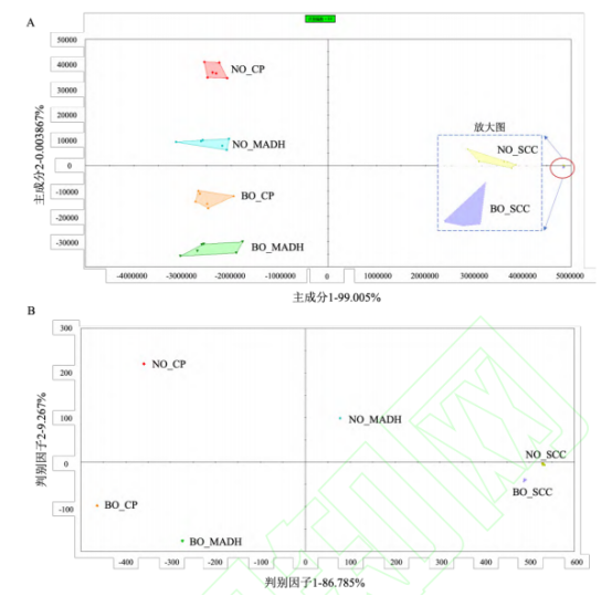 本研究以血橙和臍橙作為代表性甜橙果實原料,采用冷壓法(CP)、微波輔助水蒸氣蒸餾法(MADH)和SCC三種方法提取甜橙精油,利用氣相離子遷移色譜(GC-IMS)和超快速氣相電子鼻分析不同甜橙精油風(fēng)味組成,并結(jié)合偏最小二乘法判別分析(PLS-DA)、主成分分析(PCA)和判別因子分析(DFA)等化學(xué)計量學(xué)篩選不同甜橙精油風(fēng)味差異化合物。