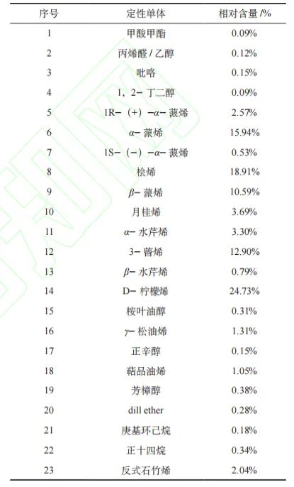 表1 胡椒精油揮發(fā)性物質(zhì)種類及相對(duì)含量