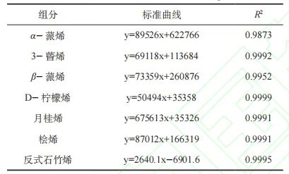 以濃度含量為橫坐標(biāo),峰面積為縱坐標(biāo),繪制各單體香精標(biāo)準(zhǔn)曲線,繪制所得各組分標(biāo)準(zhǔn)曲線的線性相關(guān)系數(shù)R2均大于0.98,可用于實(shí)際應(yīng)用。