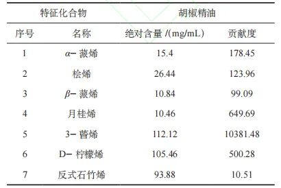 胡椒精油中各香氣成分的貢獻(xiàn)度。越南胡椒精油中貢獻(xiàn)度由大到小進(jìn)行排序:3-蒈烯>月桂烯>D-檸檬烯>α-蒎烯>檜烯>β-蒎烯>反式石竹烯。