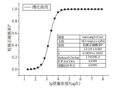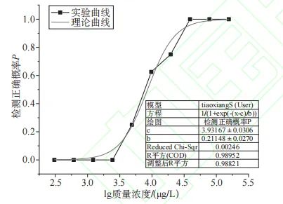 繪制以香氣化合物的質(zhì)量濃度對(duì)數(shù)為橫坐標(biāo),以正確識(shí)別概率的校正值P為縱坐標(biāo)的曲線。將上述10個(gè)數(shù)據(jù)點(diǎn),應(yīng)用S型曲線P=1/(1+e(-(X-C)/D))進(jìn)行擬合。