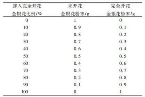 金銀花(未開(kāi)花干花、完全開(kāi)花干花);HeraclesⅡ超快速氣相電子鼻。 未開(kāi)花與完全開(kāi)花金銀花打粉,過(guò)4號(hào)篩,取過(guò)篩后的未開(kāi)花與完全開(kāi)花金銀花粉末調(diào)配為總量為1g待測(cè)樣品,充分震蕩混勻,具體調(diào)配比例見(jiàn)表1,并以此分組。