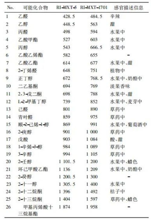 HeraclesⅡ超快速氣相色譜電子鼻具有兩根極性存在差異的色譜柱,即MXT-5(低極性)和MXT-1701(中極性),扣去空白參考后,各比例金銀花粉末色譜圖見(jiàn)圖1,2。不同比例金銀花粉末色譜圖中的色譜峰位置基本未發(fā)生變化,說(shuō)明其基于氣味的定性較為類(lèi)似,將保留時(shí)間轉(zhuǎn)換為Kovats保留指數(shù)后,經(jīng)AroChembase數(shù)據(jù)庫(kù)得出定性結(jié)果,見(jiàn)表3。
