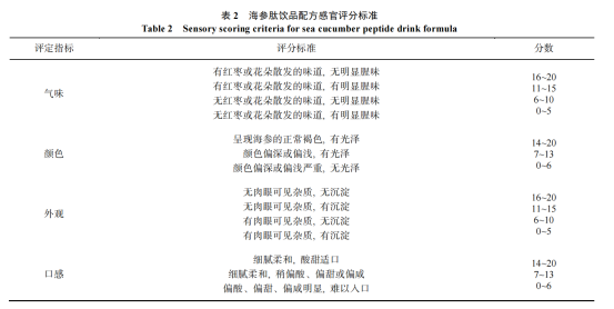 由 10 人組成感官評定小組, 分別對海參肽飲品配方的氣味、顏色、外觀、口感進(jìn)行感官評定并打分, 每項(xiàng)分?jǐn)?shù)為 20 分, 滿分為 80 分, 評分標(biāo)準(zhǔn)見表 2。