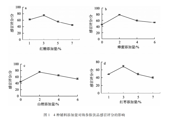 首先選擇 7 種具有一定營養(yǎng)價(jià)值的藥食同源的輔料進(jìn)行海參肽飲品調(diào)配, 其次選擇對飲品感官品質(zhì)影響較明顯的紅糖、蜂蜜、山楂、紅棗 4 種輔料進(jìn)行單因素試驗(yàn)。以海參酶解液為基礎(chǔ), 添加重量計(jì)為 100%, 其中加入酶解液添加重量 0.3%的桑葚粉、0.3%的藍(lán)莓粉和 1%的茉莉花, 制成海參肽復(fù)配液為固定值, 感官評分為指標(biāo)。固定 2%的蜂蜜添加量, 2%的山楂添加量, 3%的紅棗添加量, 考察紅糖添加量為 1%、3%、5%和 7%對海參肽飲品感官品質(zhì)的影響。固定紅糖添加量, 2%的山楂添加量, 3%的紅棗添加量, 考察蜂蜜添加量為 0%、2%、4%和 6%對海參肽飲品感官品質(zhì)的影響。固定紅糖添加量和蜂蜜添加量, 3%的紅棗添加量, 考察山楂添加量為 0%、2%、4%和6%對海參肽飲品感官品質(zhì)的影響。固定紅糖、蜂蜜和山楂的添加量, 考察紅棗添加量為 1%、3%、5%和 7%對海參肽飲品感官品質(zhì)的影響。