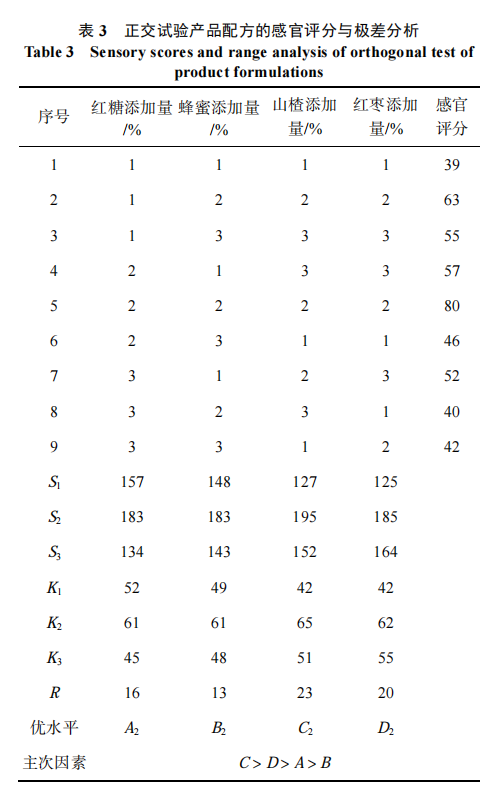 以單因素試驗(yàn)為基礎(chǔ), 選擇紅糖、蜂蜜、山楂、紅棗的添加量為正交試驗(yàn)的 4 個(gè)因素, 采用四因素三水平 L9(34)正交試驗(yàn), 綜合產(chǎn)品的感官評分值和極差分析得到 4 個(gè)因素的最佳添加量, 正交試驗(yàn)因素水平見表 1。