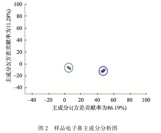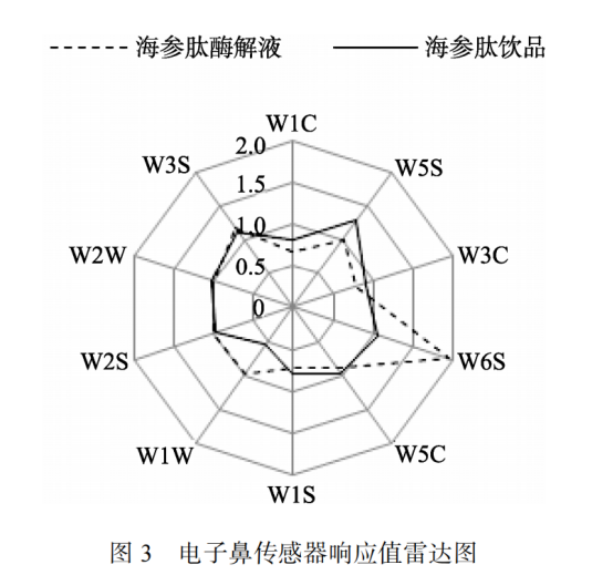 采用主成分分析法(PCA)評價(jià)海參肽酶解液與海參肽飲品的揮發(fā)性特征。由圖 2 可知, 主成分 1 的方差貢獻(xiàn)率為 86.19%, 主成分2 的方差貢獻(xiàn)率為 11.28%, 兩成分的總貢獻(xiàn)率為97.47% (>85%), 說明這 2 個(gè)主成分可以反映樣品香氣的整體信息。樣品在第一主成分上的距離越大, 則差異越大。由圖 2 可以看出, 2 種樣品在第一主成分上距離較大, 說明2 種樣品間的氣味成分差異較大, 產(chǎn)生這種現(xiàn)象的原因可能是添加輔料中的成分所起的作用。本研究選用 140 s 時(shí)各傳感器穩(wěn)態(tài)響應(yīng)值作為分析點(diǎn)建立雷達(dá)圖, 各傳感器響應(yīng)值越高表明相對應(yīng)的該類物質(zhì)含量越高。如圖3 所示, W5S、W6S、W5C、W2S、W2W 和 W3S 傳感器對海參肽飲品的香氣敏感, 表明氮氧化物、氫化物、烷烴、醇類、硫化氫類、芳香烷烴這些物質(zhì)在海參肽飲品中含量較高。