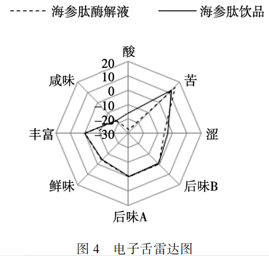 海參酶解液與海參肽飲品的電子舌檢測結(jié)果見圖 4, 結(jié)合顯著性分析(見圖 5)可以看出, 海參肽飲品與海參肽酶解液的酸味、苦味、澀味、鮮味、豐富度存在明顯差異, 其余則差異性不顯著, 引起這種現(xiàn)象的原因可能是由于海參肽飲品中加入了輔料, 其中山楂對其感官影響最大, 其次是紅糖、紅棗、蜂蜜。