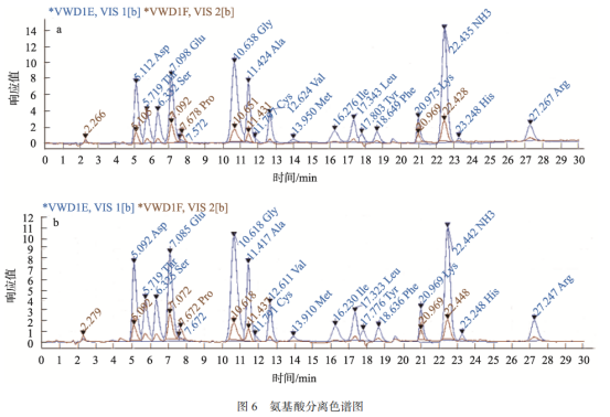 海參肽飲品氨基酸檢測結(jié)果見圖 6。圖 6a 為氨基酸混標(biāo)分離色譜圖, 由圖 6a 可以看出, 氨基酸在 30 min 內(nèi)分離效果良好; 圖 6b 為海參肽飲品樣品分離色譜圖, 由圖 6b 可以看出各氨基酸出峰良好, 出峰時(shí)間與氨基酸混標(biāo)出峰時(shí)間一致, 表明此方法獲得氨基酸含量準(zhǔn)確。海參肽飲品中的 17 種氨基酸在氨基酸分析儀上獲得了較優(yōu)的分離, 在 440 nm 波長下測定脯氨酸, 570 nm 波長下測定其余氨基酸。