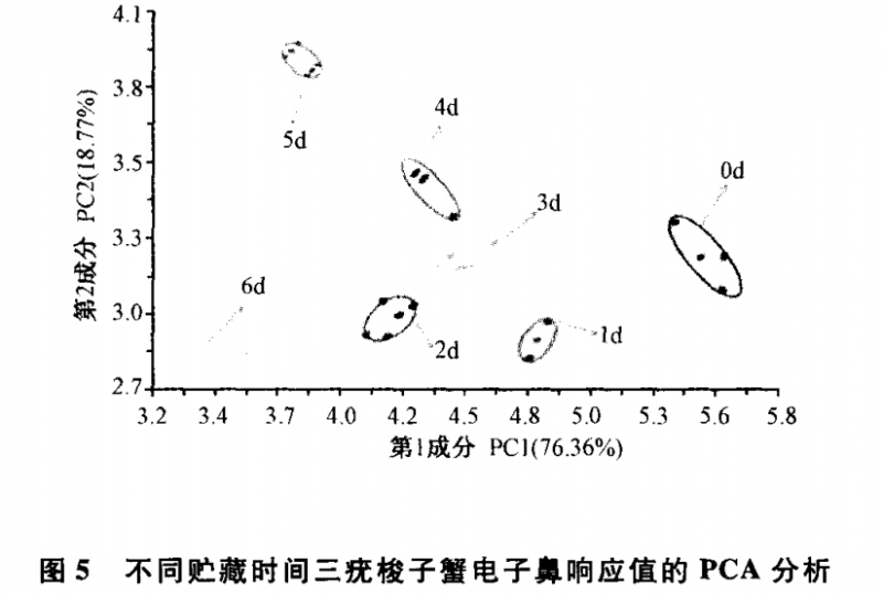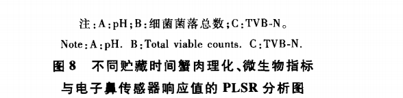 梭子蟹肉的鮮度隨貯藏時間的延長而下降。電子鼻檢測結(jié)果表明,蟹肉在貯藏過程 中主要產(chǎn)生氨、三甲胺、氮氧化合物、硫化氫、二氧化硫等揮發(fā)性物質(zhì),對揮發(fā)性 物質(zhì)采用 PCA 和 LDA分析,均能實現(xiàn)對不同貯藏時間的三疣梭子蟹樣品的有效區(qū)分識別,其中 LDA分析類別內(nèi)部的點更集中,區(qū)分效果更好。此外,電子鼻傳感器信號響應值與鮮度指標 pH 值、TVB-N含量、 細菌菌落總數(shù)的相關(guān)性較好,因此,建立的偏最小二乘回歸模型可用于蟹肉 pH 值、TVB-N 含量和細菌菌落總數(shù)的預測分析。本研究為進一步研究電子鼻在蟹及其他水產(chǎn)品鮮度定量評價方面奠定基礎 。