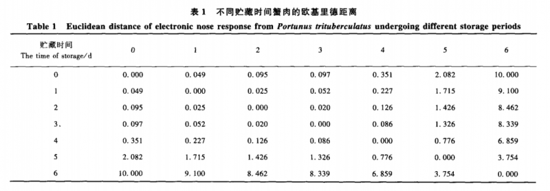 表 1顯示了各樣品氣味的差異程度,歐基里德距離越大說明差異越顯著。聚類分析的樹狀圖可以更直觀地反映不同樣品差異顯著程度。由圖 7可知,貯藏第 1、第 2、第 3天的蟹肉與新鮮蟹肉的歐基里德距離較小,貯藏第 4天與第 5天蟹肉之間的歐基里德距離較大,貯藏第 6天的蟹肉明顯與其它樣品的歐基里德距離相差較大,說明隨貯藏時間的延長樣品氣味的差異性越來越大,貯藏第 6天的蟹肉氣味與其它 樣品差異性極顯著 (P<0.01),該結(jié)果與 PCA、LDA 的結(jié)果相一致。