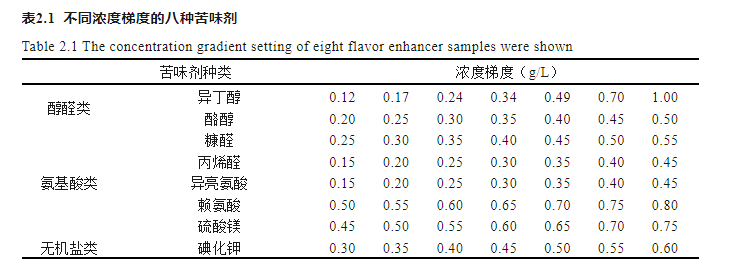 單一苦味物質(zhì)濃度:按表2.1和2.2所列的濃度,準確稱取不同量的8種苦味物質(zhì),于蒸餾水中攪拌溶解,待全部溶解后,轉(zhuǎn)移至100 mL的容量瓶中,定容,配制成表中所示的濃度,備用。