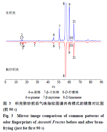 將生枳殼飲片和麩炒枳殼飲片氣味指紋圖譜共有模式(由于色譜峰主要集中在前90 s內(nèi),故選擇前90 s的色譜圖)作鏡像圖,比較兩者色譜峰的數(shù)目及峰面積變化規(guī)律,尋找專屬性差異,可直觀觀察炮制前后的氣味量比關(guān)系變化情況,結(jié)果見圖3。由圖譜可知,在前10~30 s內(nèi),麩炒枳殼相比于生枳殼,色譜峰數(shù)目有增加,例如4、6號(hào)峰;在50~70 s內(nèi),麩炒枳殼相比于生枳殼,色譜峰數(shù)目幾乎無變化,但色譜峰的峰高下降明顯,例如8~10號(hào)峰;經(jīng)計(jì)算發(fā)現(xiàn),12批麩炒枳殼飲片中8號(hào)峰(β-月桂烯)峰高平均下降54.5%、9號(hào)峰(D-檸檬烯)平均下降42.4%,10號(hào)峰(γ-松油烯)平均下降46.1%,表明枳殼經(jīng)麩炒后揮發(fā)性成分含量下降明顯。與文獻(xiàn)“經(jīng)麩炒后,麥麩皮可以吸收部分揮發(fā)油,使揮發(fā)油成分降低”論述相一致[15]。