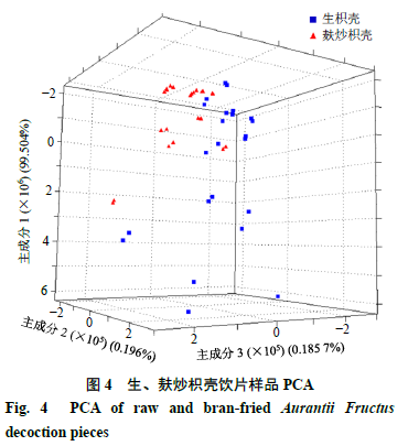 2.6.2 主成分分析(principal component analysis,PCA) PCA是一種無監(jiān)督的模式識(shí)別方法,將數(shù)據(jù)降維處理提取幾個(gè)特征值較大且能反映樣本信息變量的因子進(jìn)行線性分類,可在多維空間直觀顯示樣品間的差異,同時(shí)也可顯示變量之間的分布[11,16]。將超快速氣相電子鼻所分離色譜峰作為影響因子,進(jìn)行PCA,結(jié)果見圖4。在PCA模型中,第1主成分(PC1)貢獻(xiàn)率為99.504%,第2主成分(PC2)貢獻(xiàn)率為0.196%,第3主成分(PC3)貢獻(xiàn)率為0.185 7%,主成分累積貢獻(xiàn)率之和達(dá)99.885 7%,能較好地對(duì)生、麩炒枳殼飲片進(jìn)行區(qū)分。