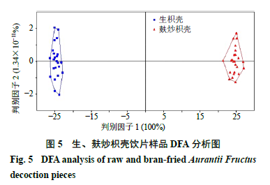 2.6.3 判別因子分析(discriminant factor analysis,DFA) DFA是在主成分分析的基礎(chǔ)上,根據(jù)某些準(zhǔn)則建立判別函數(shù),將不同組別樣本的差異擴(kuò)大,使同類樣本間差異縮小的一種具有判別分類功能的數(shù)據(jù)模型,可以用來識(shí)別和分類未知樣本[11,17]。對(duì)生、麩炒枳殼樣品的超快速氣相電子鼻數(shù)據(jù)進(jìn)行判別因子分析,結(jié)果如圖5所示,橫、縱坐標(biāo)分別表示DFA轉(zhuǎn)換得到的第1區(qū)分指數(shù)(DF1)和第2區(qū)分指數(shù)(DF2)。圖中DF1的區(qū)分指數(shù)為100%,說明DFA分析法能夠更好地從氣味角度區(qū)分生、麩炒枳殼樣品,且二者距離較遠(yuǎn),氣味明顯改變,差異較大,這也符合實(shí)際感官描述。表明氣相電子鼻可以快速鑒別生、麩炒枳殼飲片,進(jìn)一步驗(yàn)證了PCA的分析結(jié)果。