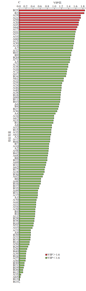 以GC-MS鑒定的73種揮發(fā)性成分相對含量數(shù)據(jù)集為基礎(chǔ),建立了工夫紅茶香氣品質(zhì)分類OPLS-DA模型,結(jié)果如圖2C所示,缺陷紅茶樣品與優(yōu)質(zhì)紅茶樣品分別位于X軸的負(fù)半軸和正半軸,兩組間分離明顯(R2Y=0.951,Q2=0.930),存在可視化的差異,與GC-E-Nose模型結(jié)果較好地吻合。置換檢驗(yàn)結(jié)果顯示,R2=0.356,Q2=-0.582(圖2D),回歸直線Q2與Y軸的截距小于0,表明模型未過擬合。該結(jié)果說明GC-MS結(jié)合多元統(tǒng)計分析可以實(shí)現(xiàn)缺陷紅茶和優(yōu)質(zhì)紅茶的準(zhǔn)確分類。