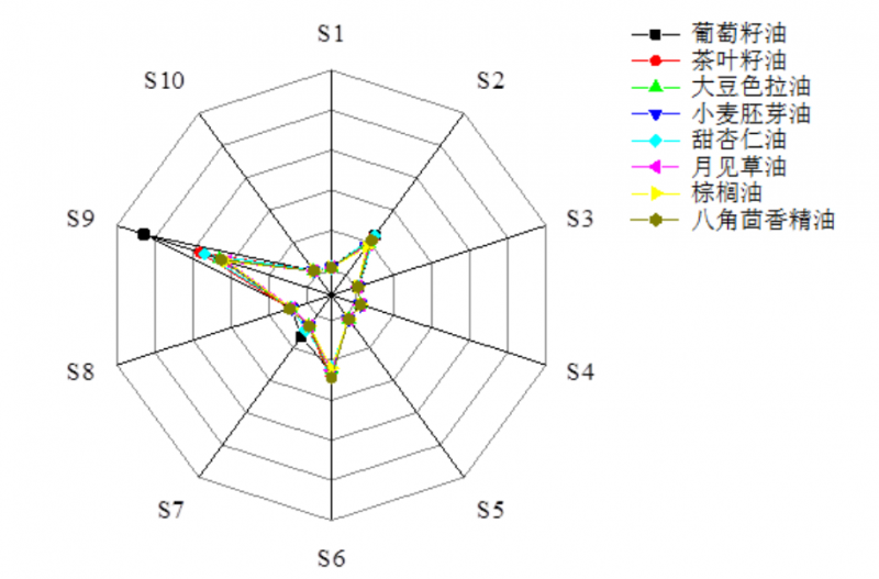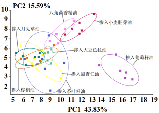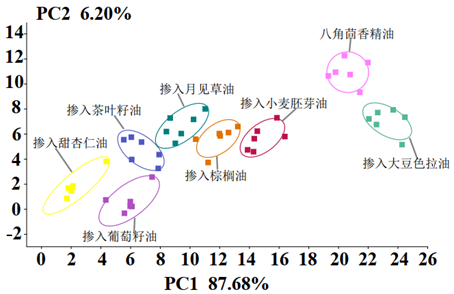 可見,應(yīng)用電子鼻結(jié)合PCA分析對摻入不同植物油的八角精油進行鑒定,能夠很好地區(qū)分鑒別摻入不同的植物油(葡萄籽油、茶葉籽油、大豆色拉油、小麥胚芽油、甜杏仁油、月見草油和棕櫚油)。