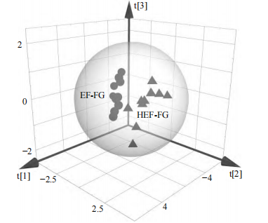 對(duì)EF-FG和HEF-FG2組樣本進(jìn)行PCA,結(jié)果見圖5。結(jié)果表明2組樣本處于2個(gè)不同方位,并存在著明顯組內(nèi)差別,第1主成分和第2主成分的變異數(shù)貢獻(xiàn)率均為96.90%(>70%),因此,EF-FG和HEF-FG可以利用電子舌進(jìn)行區(qū)分。