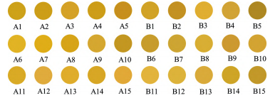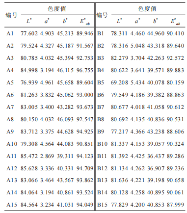 以明度值(L*)、紅綠值(a*)和黃藍(lán)值(b*)3個(gè)指標(biāo)來表示每個(gè)色號(hào),計(jì)算總色值(E*ab)。其中L*的范圍由0~100對(duì)應(yīng)表示顏色由黑到白;a*由正到負(fù)對(duì)應(yīng)表示顏色由紅到綠;b*由正到負(fù)對(duì)應(yīng)表示顏色由黃到藍(lán),計(jì)算公式為E*ab=[(L*)2+(a*)2+(b*)2]1/2,E*ab越大,顏色越淺。除此之外,可用總色差值(ΔE*ab)表示2個(gè)色號(hào)之間的色差,但其不能表示顏色的偏向,計(jì)算公式為ΔE*ab=[(ΔL*)2+(Δa*)2+(Δb*)2]1/2。樣品A1~A15和B1~B15的色度值見表3,電子眼圖像見圖6。