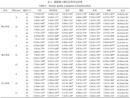 通過數(shù)據(jù)分析發(fā)現(xiàn),不同溫度或厚度會影響獼猴桃干感官評價的組織形態(tài)、硬度、粘度、滋味指標,由此得出區(qū)分不同品種獼猴桃的品質(zhì)差異在不同溫度或不同厚度下的感官指標。