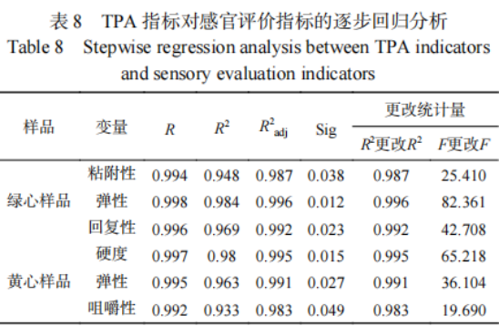 為進一步探究質(zhì)構(gòu)評價指標能否被用來代替感官評定指標,準確反映大眾的感官真實值,以TPA指標作為因變量,主要感官評價指標為自變量進行逐步回歸分析,顯著水平為0.05。其中綠心樣品的粘附性、彈性、回復性的逐步回歸分析中R均大于0.900,擬合度較高,說明對感官評價結(jié)果預測效果比較好,因此綠心樣品可以利用儀器測定的粘附性、彈性、回復性替代感官評價得分;另外黃心樣品的硬度、彈性、咀嚼性的回歸分析中R均大于0.900,擬合度較高,因此黃心樣品可以利用硬度、彈性、咀嚼性來替代感官評價得分;而紅心樣品質(zhì)構(gòu)指標替代感官評分還有待進一步研究。