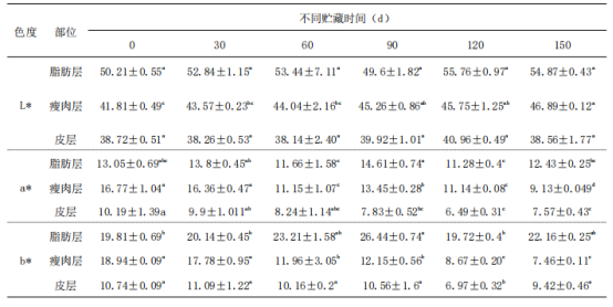 食品品質(zhì)中色澤是最直觀展現(xiàn)的指標。采用色差測試中的L*、a*、b*數(shù)值對貯藏過程中紅燒肉的色澤進行評價。由表1可以看到:脂肪層L*值和b*值0~150d沒有顯著變化,a*值呈現(xiàn)上下波動的趨勢,這可能與紅燒肉醬汁的滲透不均勻以及脂肪的氧化有關(guān);瘦肉層L*值呈現(xiàn)逐漸上升的趨勢,其中150d與前三個貯藏期有顯著變化(P<0.05),90d和120d均與新鮮的比較有顯著變化(P<0.05),經(jīng)過凍藏后,紅燒肉的亮度提升,但a*和b*值逐漸下降,表明瘦肉層的紅黃色澤逐漸褪去;皮層L*、a*、b*值變化不顯著(P>0.05),色澤實驗表明凍藏150d后,紅燒肉仍保持較好的亮度,但是紅黃色澤有所降低,這可能是由于紅燒肉醬汁的滲透和脂肪的氧化有關(guān)。