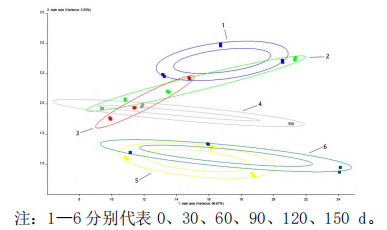 采用主成分PCA分析法,對新鮮紅燒肉至150d凍藏周期的PCA分析結(jié)果見圖4。新鮮紅燒肉至90d凍藏周期均有相交或重疊的部分,而與120d和150d凍藏的沒有相交部分,表明新鮮,30、60、90d凍藏紅燒肉的氣味不能顯著地區(qū)分開,而120d和150d凍藏的與前面的香氣組分能顯著區(qū)分,有所衰減。說明了紅燒肉氣味隨凍藏時間的延長,前期變化小,而120d后風味有所衰減,但衰減程度不大。