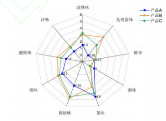 電子鼻分析結(jié)果為驗(yàn)證不同霉莧菜梗風(fēng)味差異,使用電子鼻的傳感器確定霉莧菜梗的風(fēng)味成分分類。響應(yīng)強(qiáng)度雷達(dá)圖(圖2)所示,產(chǎn)品A和C的傳感器響應(yīng)強(qiáng)度較小,并且雷達(dá)圖線幾乎重合,但產(chǎn)品C的W1W傳感器響應(yīng)強(qiáng)度略高于產(chǎn)品A。產(chǎn)品B的W1W傳感器響應(yīng)強(qiáng)度達(dá)到最高,W2W、W5S、W1S和W2S傳感器響應(yīng)強(qiáng)度相對較高,顯示無機(jī)硫化物、芳香成分、氮氧化合物、甲基類、醇類和醛酮類化合物的風(fēng)味強(qiáng)度,產(chǎn)品B>產(chǎn)品C>產(chǎn)品A。這些結(jié)果說明,電子鼻可以有效地區(qū)分不同霉莧菜梗間的氣味物質(zhì)差別。