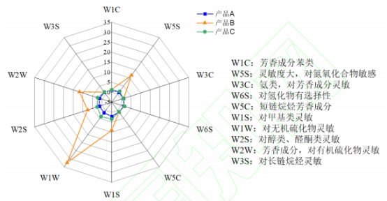 為驗(yàn)證不同霉莧菜梗風(fēng)味差異,使用電子鼻的傳感器確定霉莧菜梗的風(fēng)味成分分類。響應(yīng)強(qiáng)度雷達(dá)圖(圖2)所示,產(chǎn)品A和C的傳感器響應(yīng)強(qiáng)度較小,并且雷達(dá)圖線幾乎重合,但產(chǎn)品C的W1W傳感器響應(yīng)強(qiáng)度略高于產(chǎn)品A。產(chǎn)品B的W1W傳感器響應(yīng)強(qiáng)度達(dá)到最高,W2W、W5S、W1S和W2S傳感器響應(yīng)強(qiáng)度相對較高,顯示無機(jī)硫化物、芳香成分、氮氧化合物、甲基類、醇類和醛酮類化合物的風(fēng)味強(qiáng)度,產(chǎn)品B>產(chǎn)品C>產(chǎn)品A。這些結(jié)果說明,電子鼻可以有效地區(qū)分不同霉莧菜梗間的氣味物質(zhì)差別。