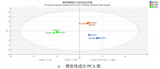 SPME-GC-MS在霉莧菜梗共鑒定出117種化合物,共有化合物24種,其中醇類32種,醛類15種,酯類20種,酮類11種,酸類5種,酚類6種,烯烴類12種,烷類10種和醚類2種。從含量上分析,產(chǎn)品A、B和C中共有的標(biāo)志性成分為對甲酚和正壬醛,差異成分為苯乙醇和正庚醇。從OAV值分析,在OAV大于1的化合物中,產(chǎn)品產(chǎn)生氣味的標(biāo)志性成分有正壬醛、辛醛和對甲酚,它們是所有產(chǎn)品中共有的成分,分別有醋味、水果香味和煙熏、草藥味;大馬士酮、(2E)-2-癸烯醛和芳樟醇分別是產(chǎn)品A、B和C中獨(dú)有的且OAV值較大的化合物,分別貢獻(xiàn)煙草味、家禽味和檸檬味,它們是樣品產(chǎn)生氣味的差異成分。