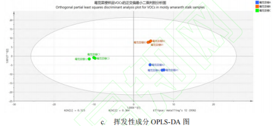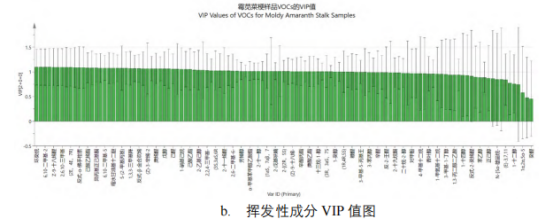 由圖4-b所示,VIP>1的化合物有75種,其中OAV≥10000的成分有2種,有己酸乙酯和芳樟醇,貢獻(xiàn)水果和薰衣草氣味。正庚醇在產(chǎn)品B中含量達(dá)到1.88g/L,貢獻(xiàn)刺激性氣味,并且它的VIP>1、OAV≥1且含量較高。因此,正庚醇、己酸乙酯和芳樟醇是霉莧菜梗的重要差異物,這和霉莧菜梗含量差異結(jié)果、OAV分析結(jié)果一致,正庚醇、己酸乙酯和芳樟醇在影響傳統(tǒng)發(fā)酵霉莧菜梗的風(fēng)味方面具有重要作用。利用PCA和OPLS-DA可變投影VIP值分析能分析出差異性物質(zhì),這些差異性物質(zhì)有可能是傳統(tǒng)發(fā)酵霉莧菜梗的獨(dú)特風(fēng)味。