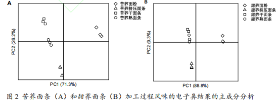 以上研究表明,擠壓加工及熱風(fēng)烘干可以促進蕎麥面條風(fēng)味的形成,特別是熱風(fēng)干燥,其中全苦蕎面條風(fēng)味更加濃郁。
