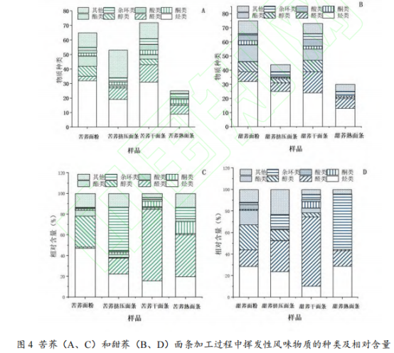 蕎麥營養(yǎng)全面,富含多酚、黃酮等生物活性成分,對人體有顯著的健康效益。蕎麥制品尤其是其面條制品在世界范圍內(nèi)受到了越來越多的關(guān)注。本文主要研究全苦蕎面條和全甜蕎面條在擠壓加工及烘干、蒸煮過程中的主要揮發(fā)性風(fēng)味物質(zhì)組成和變化情況。