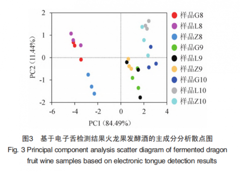 為了進(jìn)一步探明產(chǎn)地和采收時間對紅肉火龍果發(fā)酵酒品質(zhì)的影響,本實(shí)驗室前期利用貴州省3個產(chǎn)地(關(guān)嶺、羅甸和貞豐)和3個采收時間(8月、9月、10月)的紅肉火龍果 釀造了發(fā)酵酒,并對其火龍果酒的基本質(zhì)量進(jìn)行了評價。本研究在此基礎(chǔ)上利用智能感官技術(shù)(電子鼻和電子舌)對不同采收時間(8月、9月、10月)及貴州產(chǎn)地(關(guān)嶺、羅甸、貞豐)火龍果的發(fā)酵酒氣味及滋味特征進(jìn)行研究,對其進(jìn) 行主成分分析,并采用頂空固相微萃取-氣相色譜質(zhì)譜聯(lián)用儀對其揮發(fā)性風(fēng)味成分進(jìn)行分析,以期揭示不同產(chǎn)地和采收季節(jié)火龍果釀造發(fā)酵酒的風(fēng)味差 異規(guī)律,為貴州省火龍果發(fā)酵酒的品質(zhì)控制提供參考。