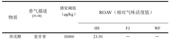 本實驗通過對HS、FJ和WF樣品中的揮發(fā)性化合物進行檢測,共檢測出揮發(fā)性化合物57種,其中醇類22種、醛類6種、酸類4種、酯類8種、酮類9種、其他類8種。對3組樣品中揮發(fā)性化合物相對含量與種類進行PCA分析與聚類分析發(fā)現(xiàn),HS組揮發(fā)性化合物數(shù)量較多,其中主要物質為芳樟醇、2-壬醇和2-十二烷醇等物質;FJ組主要揮發(fā)性化合物為2-壬酮、2-十一酮等物質;WF組揮發(fā)性化合物種類豐富,其中酸類物質與醛類物質占據主導,為后續(xù)風味物質的形成奠定了基礎。通過ROAV值大小對濃汁發(fā)酵前后關鍵風味物質進行判定,發(fā)現(xiàn)HS與FJ樣品中關鍵風味物質種類幾乎一樣,分別為14種和13種;反觀WF樣品中關鍵風味物質種類較少,僅有7種,這說明經過發(fā)酵后的馬鈴薯濃汁在關鍵風味物質方面具有顯著性改善。