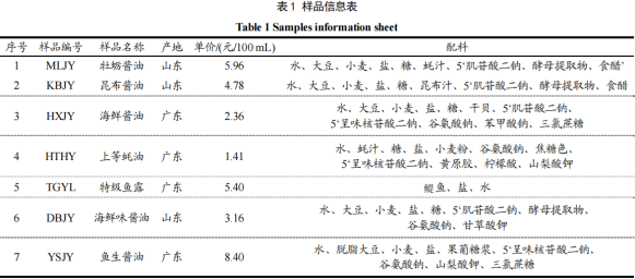 用于分析測(cè)試的海鮮調(diào)味汁分別為不同產(chǎn)地的典型代表性產(chǎn)品,分別為牡蠣醬油、昆布醬油、海鮮醬油、上等蠔油、特級(jí)魚(yú)醬油、釀造醬油、魚(yú)生醬油(上述樣品均為n=3),分別購(gòu)自廣東廣州的超級(jí)市場(chǎng)和京東商城。樣品信息見(jiàn)表1。