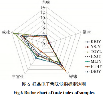 用智舌對(duì)7類(lèi)樣品的滋味進(jìn)行定性分析,將7類(lèi)樣品的有效味覺(jué)指標(biāo)數(shù)值做出雷達(dá)圖。從圖可以明顯看出7類(lèi)樣品在咸味、鮮味和豐富性指標(biāo)上存在明顯的差異,HTHY最鮮,TGYL最咸,而MLJY和DBJY滋味最為豐富。各類(lèi)樣品在苦味和澀味方面的差異則相對(duì)較小。