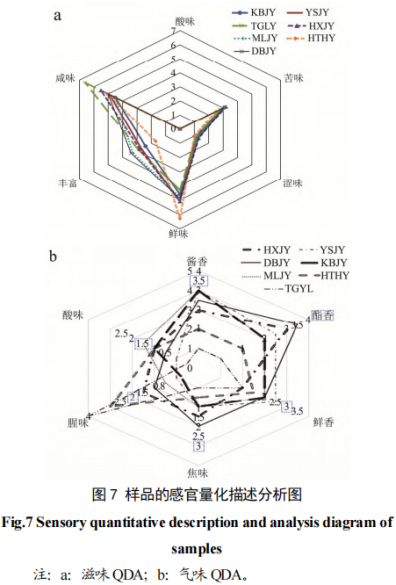 從圖a可知7類(lèi)樣品的后味存在明顯差異,在咸味和鮮味指標(biāo)上的感官評(píng)分也各不相同,然而在酸味、苦味和澀味這三項(xiàng)的味覺(jué)指標(biāo)上則差異不大,尤其是酸味,感官評(píng)分均為0,說(shuō)明評(píng)鑒員品嘗不出這7種樣品帶有酸味。