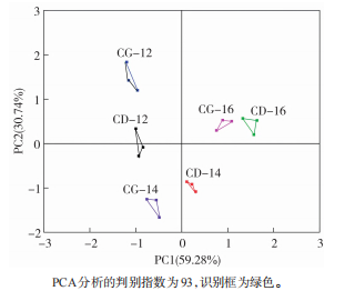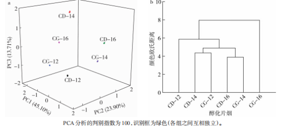 對(duì)樣品的電子眼數(shù)據(jù)進(jìn)行PCA分析,結(jié)果如圖2a所示??梢钥闯?,主成分1(PC1)、主成分2(PC2)和主成分3(PC3)之和達(dá)到了82.71%,可代表樣品的絕大部分信息。同時(shí),判別指數(shù)是用來(lái)表征樣品之間區(qū)分度大小的一種判斷方法。本實(shí)驗(yàn)中煙葉顏色的判別指數(shù)(評(píng)價(jià)選定目標(biāo)的判別質(zhì)量)為100,說(shuō)明通過(guò)電子眼能有效區(qū)分不同包裝樣品的顏色差異,且存在一定可靠性。另外,不同樣品各自聚在一起,說(shuō)明在不同包裝和醇化時(shí)間下樣品顏色分布均存在明顯差異?;跉W氏距離可以判斷不同處理間樣品差異程度。圖2b中CD-12、CD-14、CD-16、CG-12和CG-14處理聚為一組,說(shuō)明其顏色存在一定相似性;而CG-16處理與其他處理距離最遠(yuǎn),說(shuō)明其顏色與其他樣品差異最大。故從煙葉顏色看,充氮包裝處理在一定程度上延緩了醇化過(guò)程煙葉顏色的褐變加深。