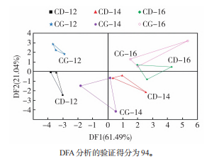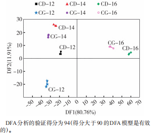 為進(jìn)一步分析不同包裝方式醇化片煙香氣成分的差異,對(duì)3個(gè)醇化期不同包裝方式的片煙樣品揮發(fā)性成分指紋圖譜進(jìn)行了判別因子分析(DFA),結(jié)果如圖5所示。電子鼻的判別因子影響值總和為92.67%(DF1為80.76%,DF2為11.91%),驗(yàn)證得分94。從DFA模型圖中可以看出,醇化12、14月時(shí),兩種包裝煙葉的氣味主要在DF2有明顯區(qū)別;而醇化16月時(shí),充氮包裝與常規(guī)包裝的片煙在DF1和DF2均有差別。整體來(lái)看,DFA判別模型結(jié)果與氣味指紋圖譜的PCA分析結(jié)果相吻合,說(shuō)明通過(guò)電子鼻能有效區(qū)分不同包裝方式醇化片煙樣品揮發(fā)性成分的差異。